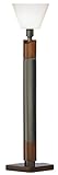 This contemporary torchiere style table lamp features a distinguished look with its deep patina bronze finish and cherry wood accents. It has a hi-lo in-line switch for functionality and an oval white frosted cased glass creating that stylish look.